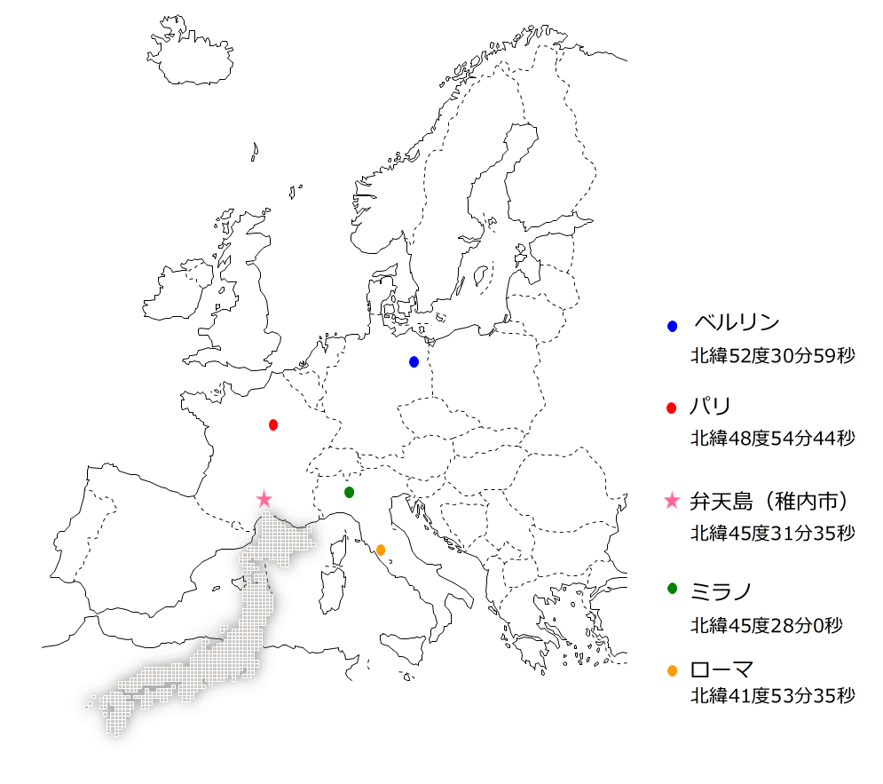 一般に、ヨーロッパ諸国は我が国よりも( B )に位置している。都市で比較するならば、我が国の最北端である稚内市と緯度がほぼ同じなのはイタリアの( C )である。フランスの首都パリ、ドイツの首都( D )はさらに( E )に位置する。なお、東京は北緯35度にあるが、それよりも( F )にあるヨーロッパの都市はない。